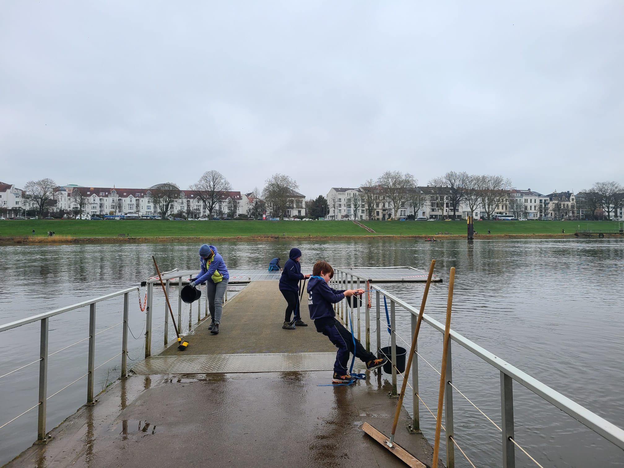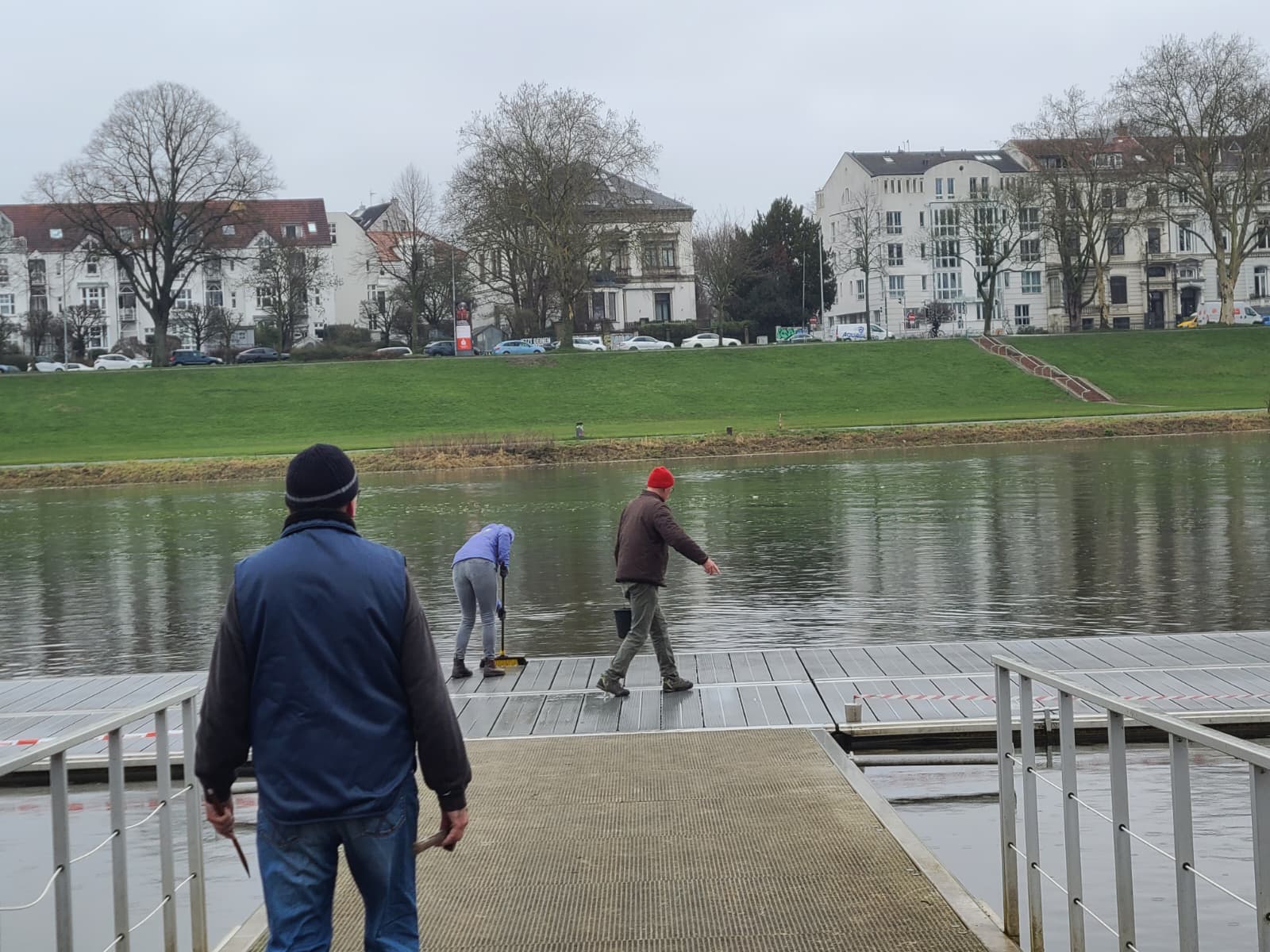 Bei kühlem, aber überwiegend trockenem Wetter wurde an vielen Stellen gleichzeitig angepackt: Im Fokus standen vor allem Aufräum- und Vorbereitungsarbeiten an den Containern beim Lidicehaus sowie das Verholen des neuen Anlegers an die Kleine Weser.